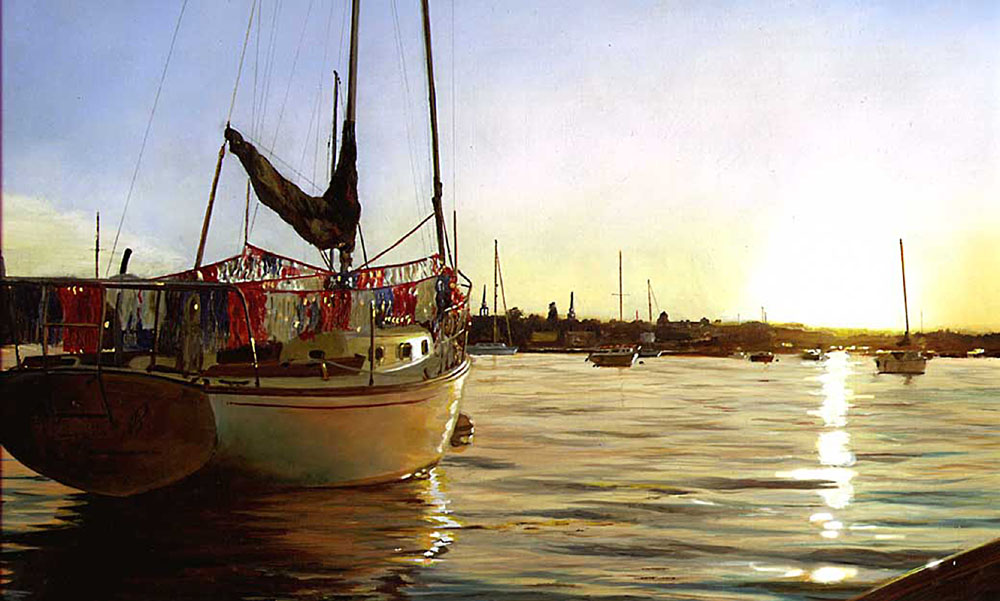 In 1998, he transitioned to fine art working in watercolors and oils. He sketches his subject matter on site and then finishes the pieces in his studio. Rob’s work includes large oil paintings with examples on display at the American Heritage Museum in Hudson. His subject matter there includes historical interpretive scenes of artifacts in their collection. He teaches at the Senior Center and is an avid sailor and member of the American Yacht Club.