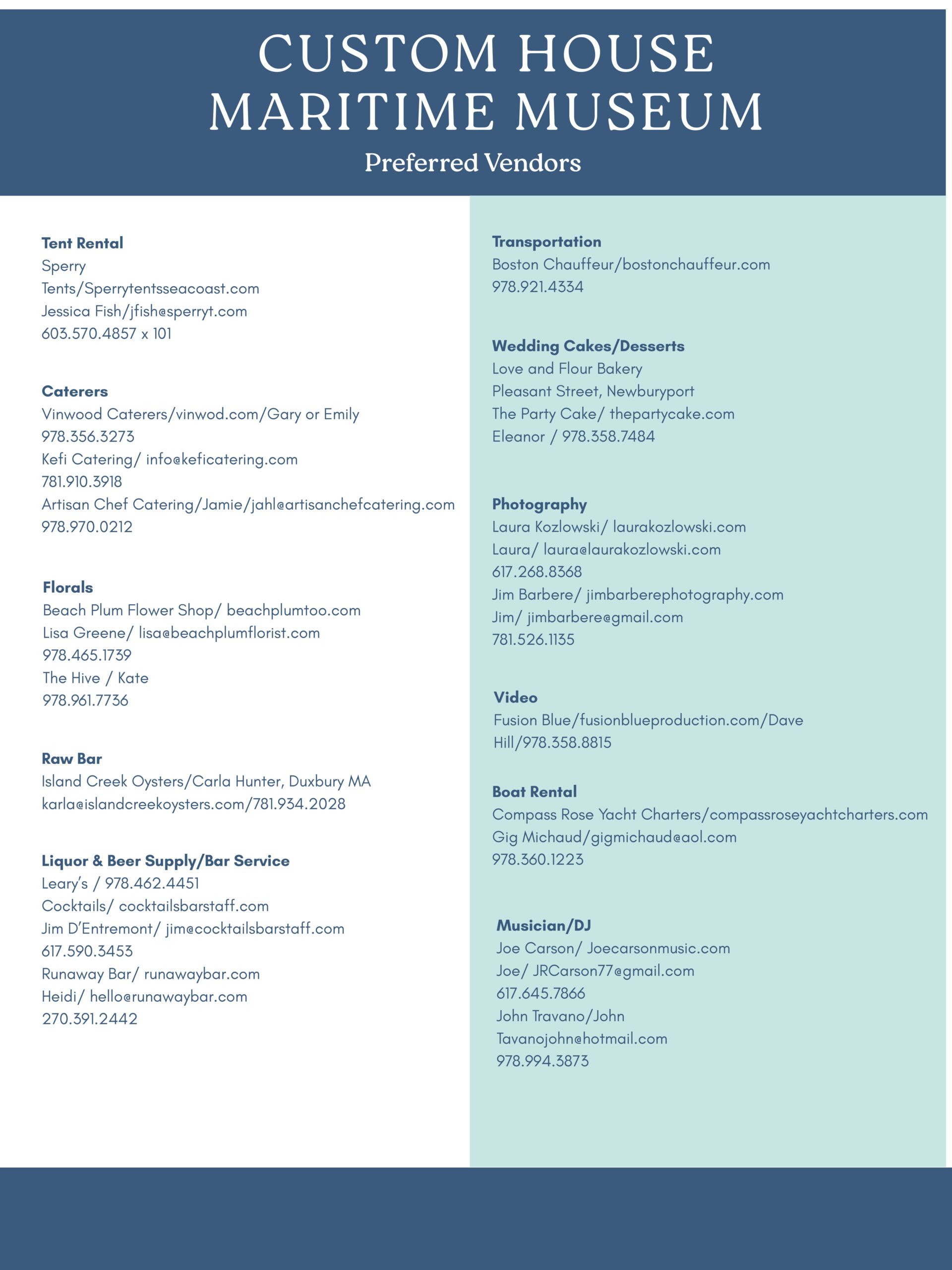 Often described as ‘The Gem of Downtown Newburyport,’ the Custom House Maritime Museum (CHMM) is the perfect location for your special event. We regularly host elegant coastal weddings, bar and bat mitzvahs, rehearsal dinners, birthday parties, corporate events and much more.