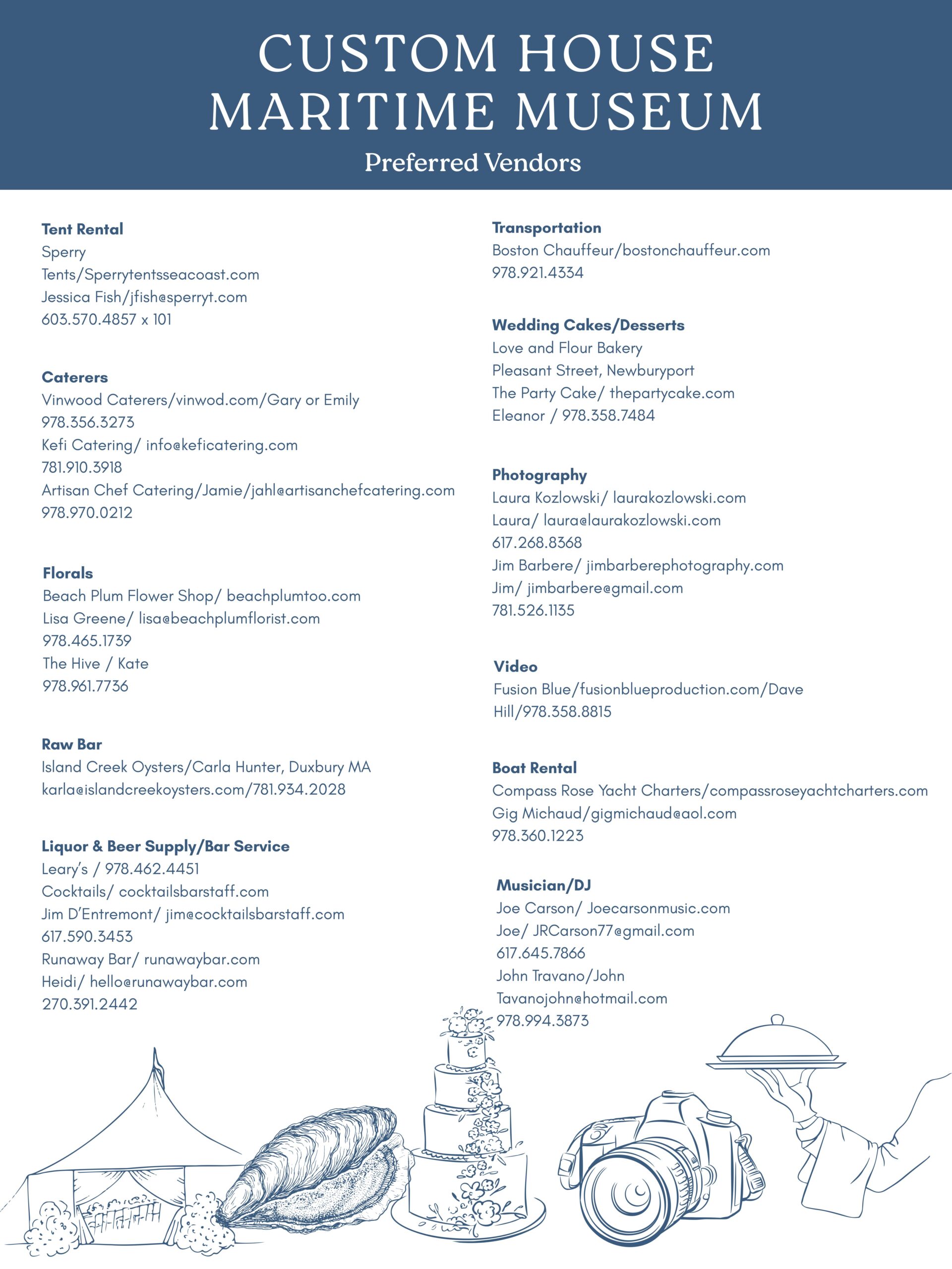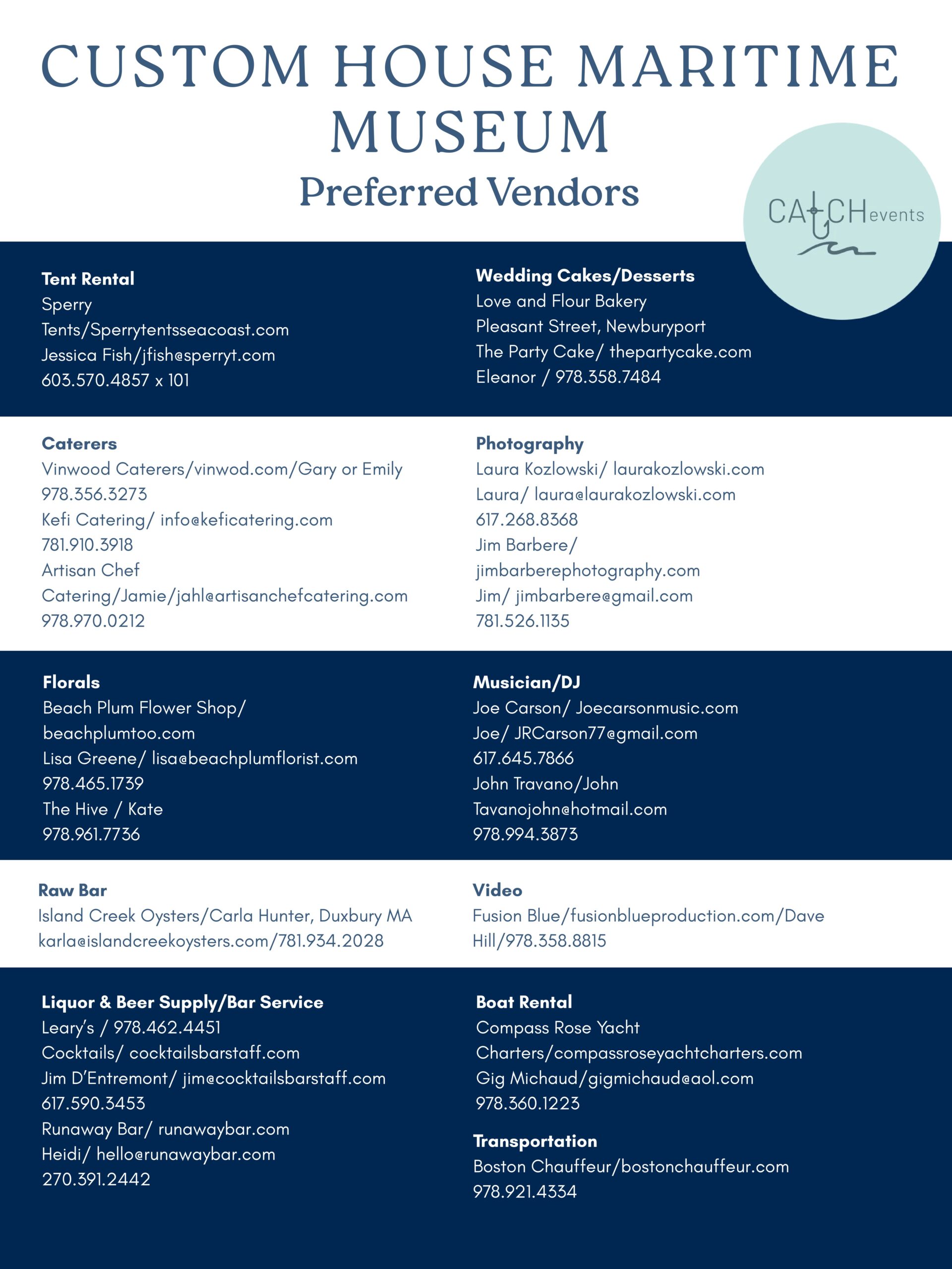 Want to arrive by boat? Need a catering company? Entertainment ideas for your guests? Want to add some local flair to your event?
